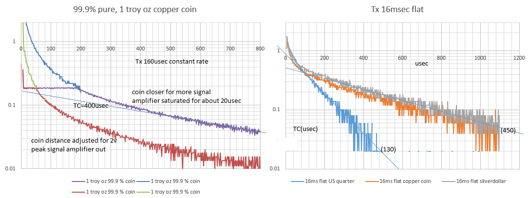 Recorded data for the first graph with coin at two locations. Centered on coil, amplifier out not saturated at 6usec delay. The second, target was moved closer to edge adjusting for maximum signal. Coin position had a small effect on decay curve. The data for the second graph was taken for a thread discussing constant current vs constant rate Tx. Longer Tx(16msec) moved the constant slope decay(TC)closer to Tx off. Maybe used a different coil and amplifier from the first graph. TC a little higher than first graph. Any thought why the TC, PI vs VLF is so much different? VLF Tx frequency looks like it made a difference, 147 vs 200usec. Would you expect it to be closer to 400usec if VLF Tx frequency was lower? With the PI, 160usec Tx pulse I need to look at the decay curve past 500usec before the decay becomes straight. The TC of the borrowed silver dollar and copper coin were close.Attached Files