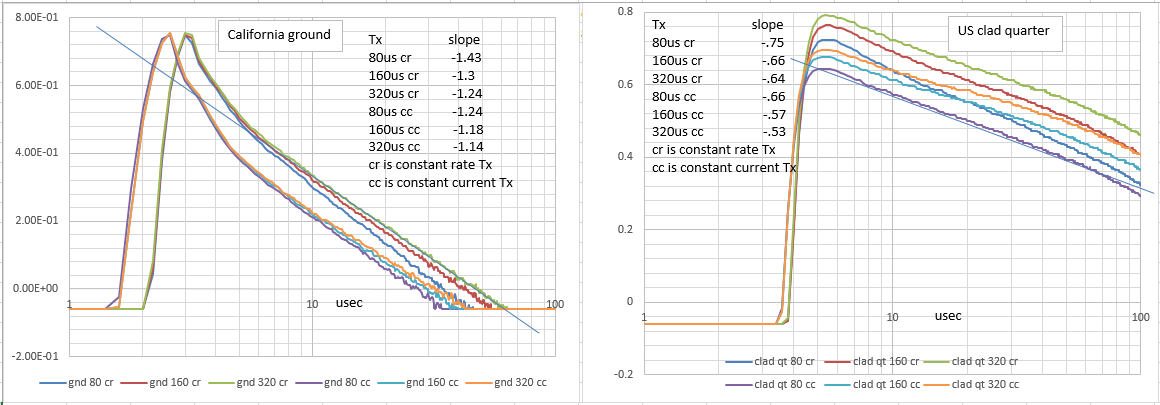 Thought I would record some US coin decays and see if I could use Excel to experiment with delay and sample timings. I'm using Tx=160usec, target delay=6usec, target sample=10.2usec, ground delay=4usec, ground sample=100usec. with my detector. Set record time for over 200usec to try longer sample times. Didn't work as good as I would like. Not enough amplitude or time resolution with my scope recording. Had to reduce target sample time from 10.2usec to 8.8usec to cancel ground signal. Not what I was hoping but maybe someone can learn some thing from the data. A picture is worth a 1000 words. I've been trying to chart the data so when looking at the chart I could get a feeling for signal increase or decrease with GB on. The log-log chart seems to be best(straight line decay for ground), but still not easy to tell how much signal increases or decreases. If the target decay is parallel to ground decay the signal would be zero. Any ideas on reading the chart or a different chart would be appreciated. I can experiment with timings on the bench but was hoping the chart would show why the GB signal was getting better or worse for different targets.
