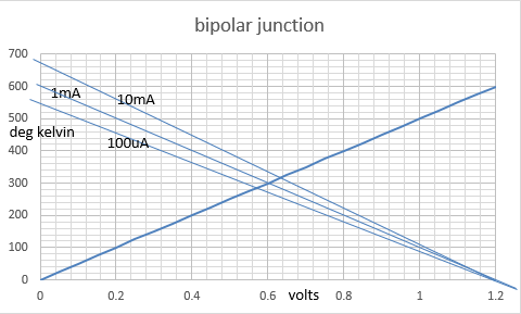 Now draw a straight line from 1.2 volts and 0 Kelvin, to 0 volts and 600 Kelvin. That straight line represents current density. You don't know the literal density, but current is something you can measure and design a circuit around. For starters, call this current 1 milliampere, just to be able to call it something. If the bipolar junction is a small-signal transistor with the base connected to the collector operating as a "transdiode" voltage reference, the 1 mA value you assumed will probably be close to correct. But we'll get to "fudge factors" in a little bit. For now, that line is 1 milliampere.