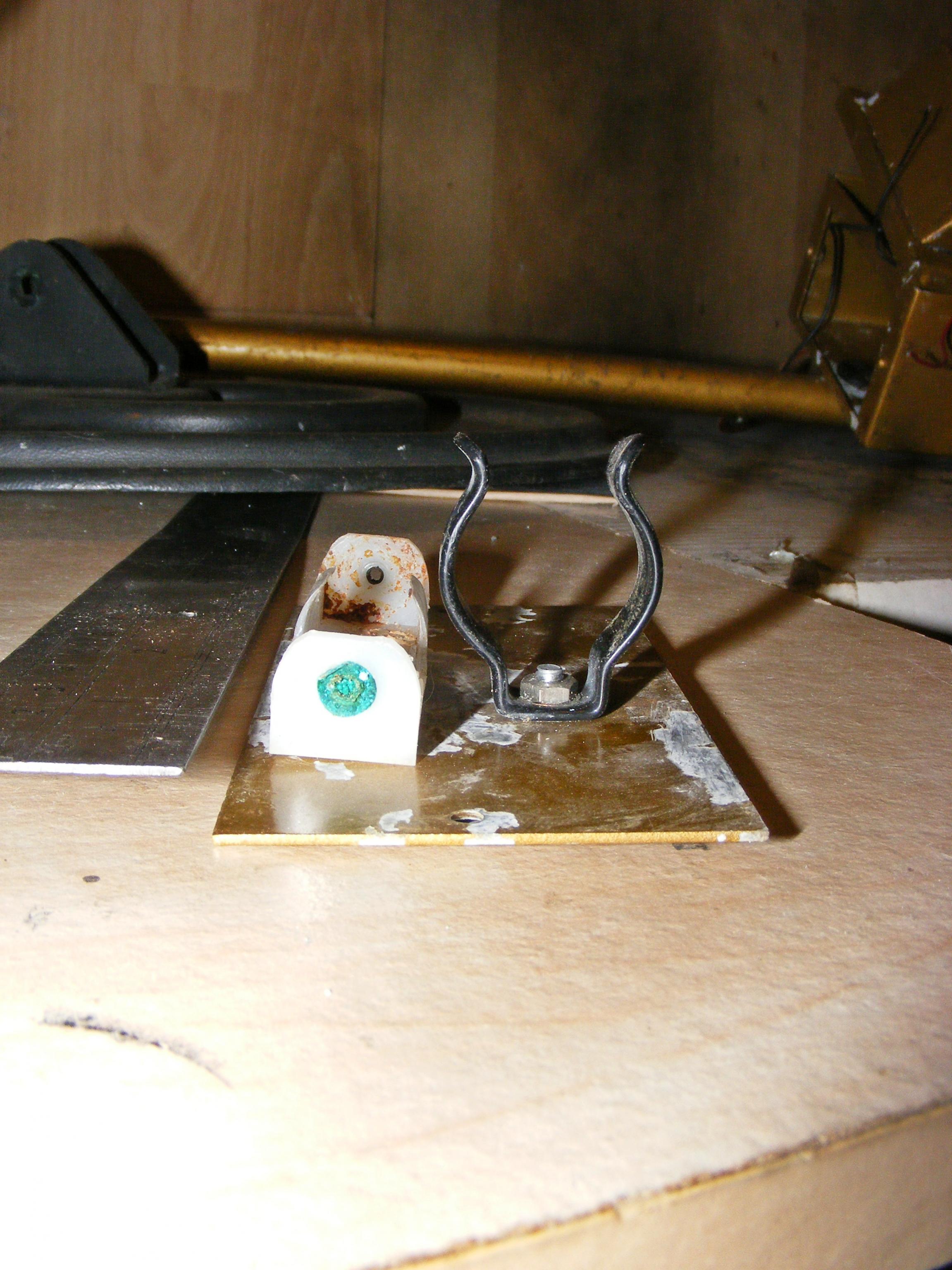 also there is a battery holder for one 1.5v battery which need replacing as it is totally shot because of a battery been left in for a long time. this is no a problem. but there is also two battery terminals which looks like they would fit a standard square 9v battery, but the fitting are to dig to fit on plus you can not put both on together anyways. any ideas what voltage that will be running on?