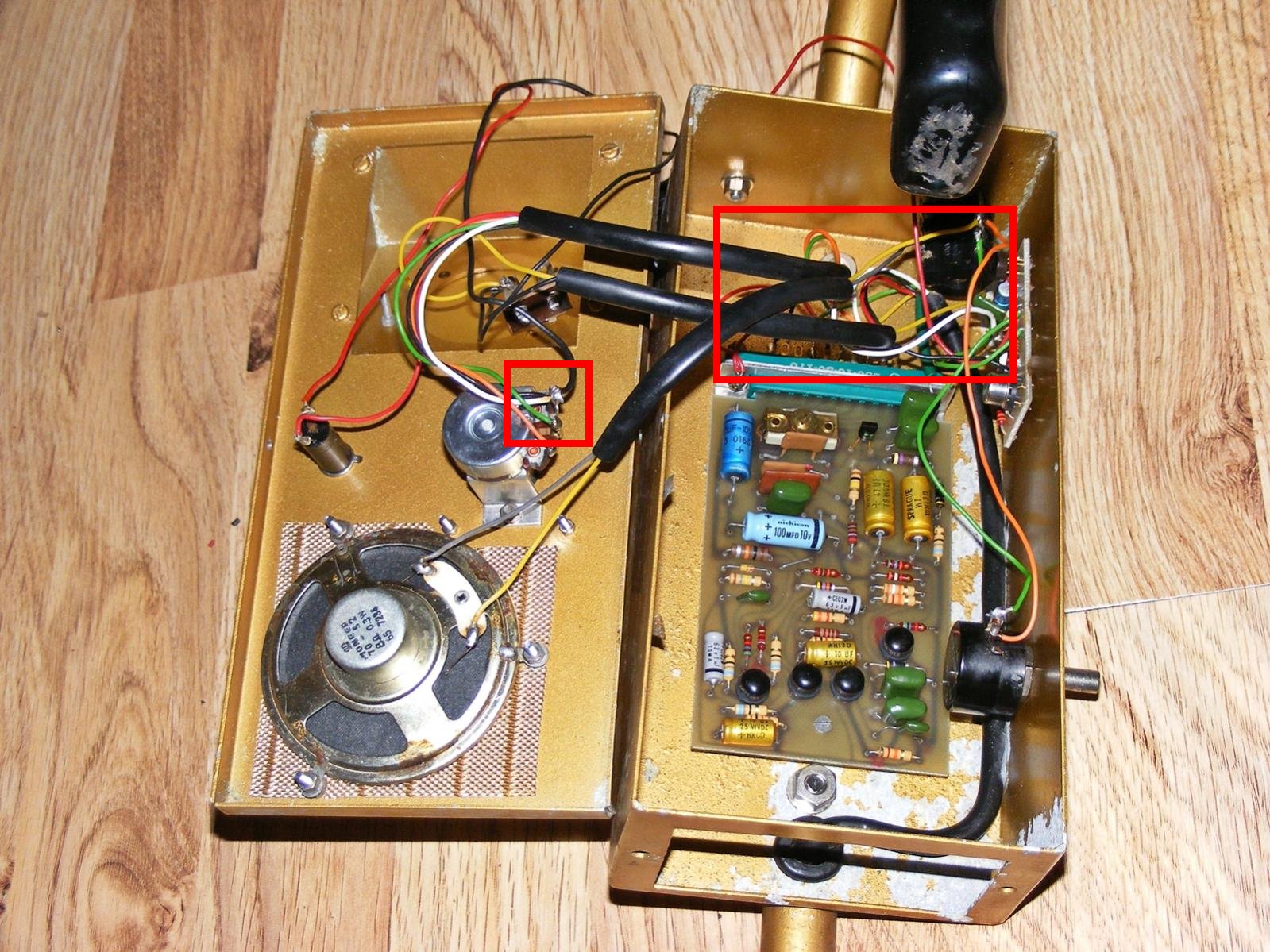 We need pics of wires coming from coil cable attached to mainboard connector strip and better pics of all internal wiring. The idea is for us to be able to see specific wires and where they are connected so we can work out generally how this detector is put together. Then we will know where to look for the fault. If you know how to use a VOM to check for continuity then its easy to check each transistor and diode. There are five PNP transistors 2N3638A(the four black top ones on mainboard and one on smaller board), one 2N4403 PNP( the small one on mainboard) and another transistor on smaller board which i cant see the number on it, plus a few diodes. All these components are easy to check for integrity with a multimeter(VOM). Even you can do it without much any knowledge of electronics.