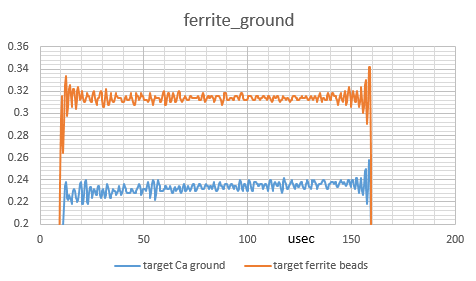 I recorded amplifier out with a ferrite bead and some California ground using an IB coil and my bench PI awhile back. Tx 160usec constant rate(6250 amps/sec). Copied scope signal to Excel to see slope better, both looked flat on the scope trace. Been playing with spice today, constant rate pulse. 10uH parallel with .001 ohms(10,000usec time constant)gives a fairly flat signal during Tx. 1000usec TC has some decay slope. Something over 10,000usec should be flat. The ground signal is higher at the end of Tx. Ferrite doesn't show a R signal after Tx off delay, ground does.