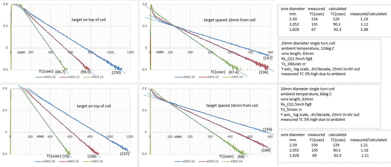 Got some larger diameter wire today. Charted the TC. I think I always get a little higher TC than you. Think it might be because I'm measuring decay Tx off and you are measuring TC Tx on. I need to figure why. Included the charts showing what I think is skin effect, one or two TC before straight line decay. I'll try to make some rings next.