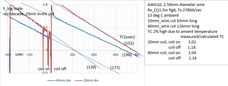 I'll write something for the calibration part tomorrow. Did a test, coil on and off. TC coil on less than coil off, same as I've seen in the past. Any idea why. Coil off doesn't show much skin effect for the 40mm diameter coil. Had to move 20mm coil closer to Rx to get an acceptable coil on recording.Originally posted by Skippy View PostFunny thing how the time-constant doesn't change much with ring size doubling, isn't it? Obviously resistance doubles, and a first-approximation is that inductance depends on the length of the wire in the loop, so L roughly doubles, too. Hence L/R is nearly the same.