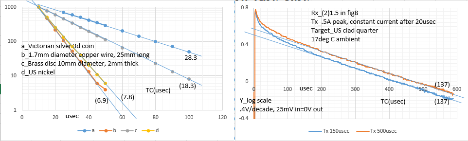 Good tests. Charted your data linear-log to see how it looks the way I chart. Straight line decay except for one point, 3 instead of 4 would fix that. My decays usually chart straight line after one or two target time constants. Wondering if you could test a US clad quarter out to 600usec to see if you get something similar to what I get. Maybe every 10us starting at 10us out to 100us, every 20us to 200us, every 50us to 600us. What ever works for you. I tried 150us and 500us Tx, both had the same final slope. I could try something different if wanted. I get close to 10us time constant for a US nickel.Originally posted by Ferric Toes View PostI would suggest that 'skin effect' is visible and measurable on a PI detector. That is the time that elapses before the response settles down to a single time constant, i.e the late time referred to in Geonic's TN-7 report p-p 6-8. This is clearly seen in the case of a Victorian silver 3d coin I tested where an exponential fit was not obtained until measurement times exceeded 25uS. [ATTACH]45271[/ATTACH] Leaving out the first three data points shows the good fit. [ATTACH]45273[/ATTACH] Even a 25.4mm length of solid copper wire. 1.7mm diameter exhibits the effect by the deviation of the exponential fitting curve from the 10uS data point. [ATTACH]45274[/ATTACH]. The wire was mounted such that it was longitudinal in the coil i.e. parallel to the field lines.