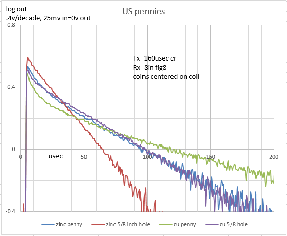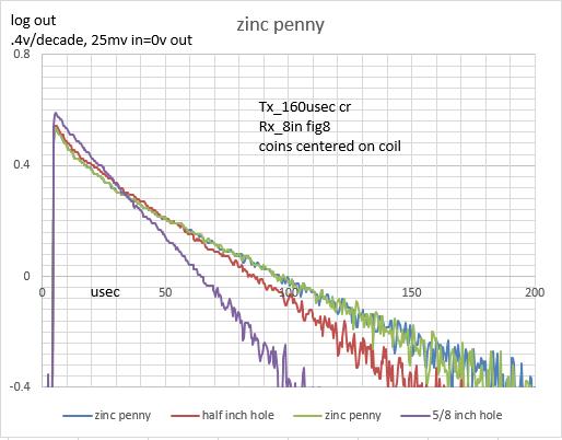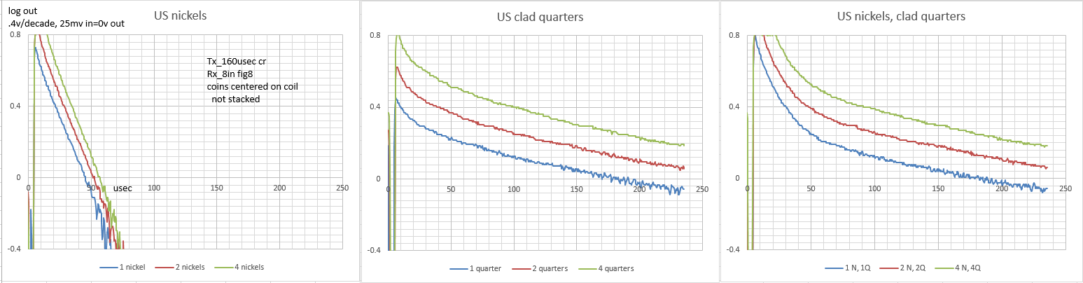 More charts. Did some awhile back with 1,2,3 4 and 5 coins. Doubling number of coins doubled Rx signal so this time just did 1, 2 and 4 coins. Coins side by side doesn't seem to effect decay TC so using more coins is another way to improve S/N. Still don't know if charting linear-log or log-log is better and if 250usec is long enough. 250usec isn't long enough to get true TC for some targets but does it matter unless looking for silver bars?Attached Files