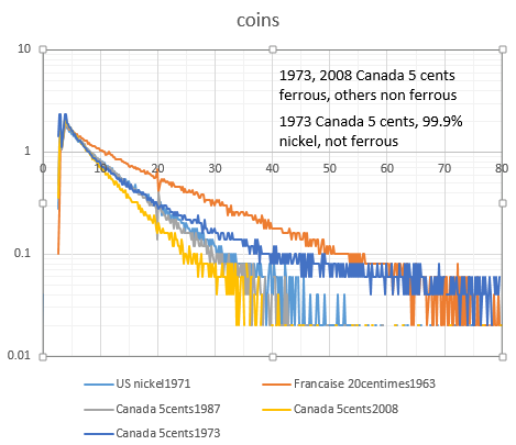 Bear in mind I'm using a 13kHz machine, skin effect is certainly going to mess up my long TC coin measurements ( eg I think a silver dollar is fc about 1150 Hz, whereas it's true value is probably 750 Hz ) .... so coins with Fc of 7 - 25 kHz are probably best for accuracy.
