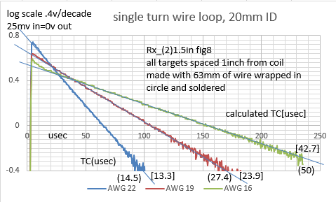 Tested some single turn wire loops awhile back with AWG19 wire, 20 40 and 80mm diameter. Don't know where I posted the data. Measured TC was higher than calculated. Tested 20mm diameter loop with AWG22, 19 and 16 that I've been playing with. They measured a higher TC than calculated also. When I first made them I thought the solder joint would make total resistance higher which would make measured TC lower than calculated(TC=L/R). Maybe I'm doing something wrong? Looks like a way to make higher TC targets with close to straight line linear-log decay at low delay times.