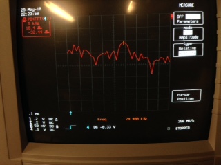Chiv has got the spectrum analyser function on his USB 'scope sorted out, and has measured the 'field multi' waveform. It matches the freqs we've discovered, 7.8, 18.2, 39kHz, though the amplitudes don't match, I'm not sure why. He's using a pickup loop with resistive damping to calm the self-resonance. The traces he gets are a mimic of the Transmit voltage, ie. the square wave, not the triangle current/mag field response.