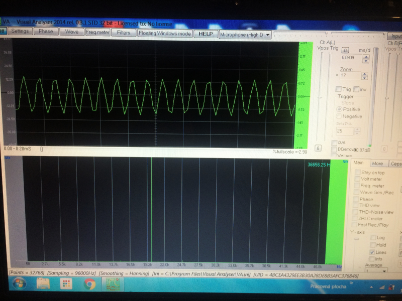 ..and it's pretty good it works ... it works well on both oscilloscope and frequency analyzers .. You can adjust them to on the notebook sound card a microphone recorder for the 24 bit-96khz range, and amplify the signal appropriately. You will also have to set the settings in the Visual Analyzer - set-fft -size samples to 500-64000 and frequency sapling to 100000 Hz and Bit depht to 16 or 24 bit. Another setting requires an oscilloscope - Approximately x20 and long sample at 0.3 ms and less, and also in the X-axis and Y axis Main Settings and the On-Of- and Average setings..1-200..