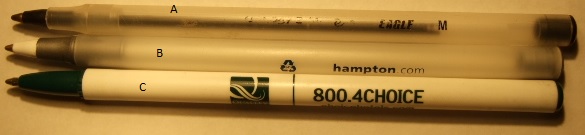 Don't have a pen with Bic on it but some similar to a Bic pen. I'll try to find a Bic, don't know if all Bic pens would be the same. Pen A was the first I tried, about the same as a 4 grain nugget I have. Looked like an easy target until I tried pen C.