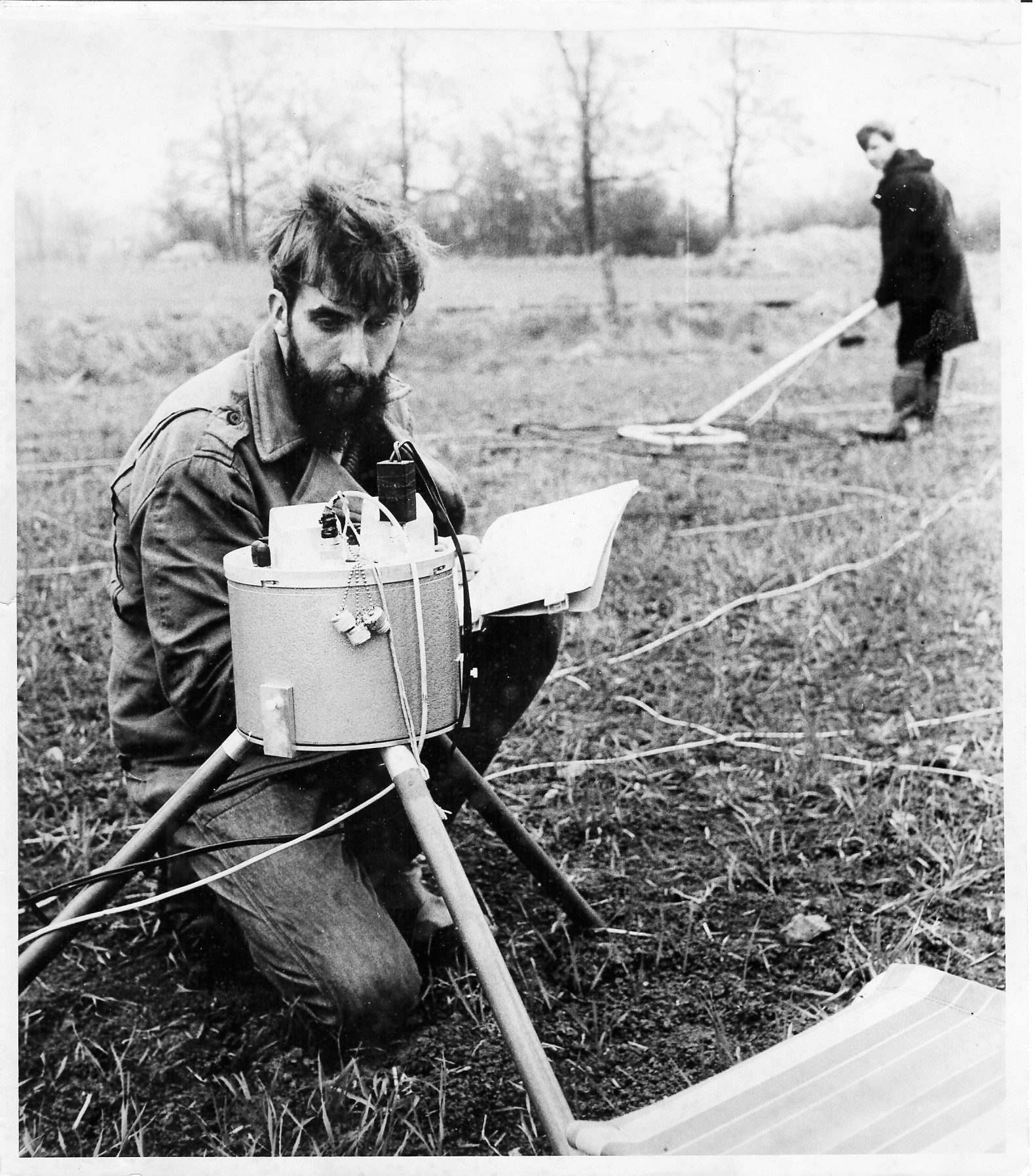 Myself taking readings from Claus Colani's PI detector in 1967. A technician is positioning the search coil on the 10m square nylon grid placed on the ground. The grid is divided into 1m squares with 0.5m markers.