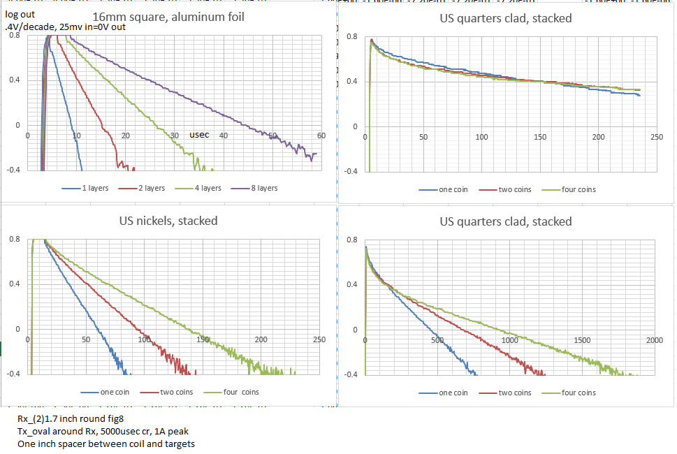 Quarter and stacked quarters, not straight line decay, effected by skin effect. Chart straight line decay at longer delay times.>2 or three target TC's? Chart close to same at normal sample times so wouldn't effect detection depth.
