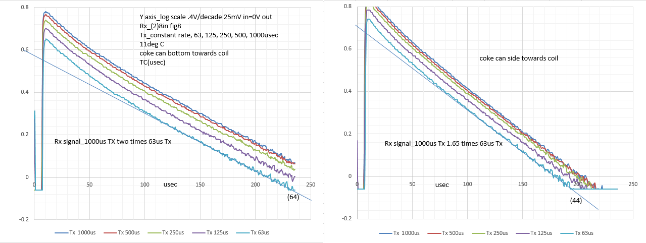 Thanks, that explains constant rate(infinite coil tau). I charted it because the coke can has a tau lot less than 500us. Wasn't thinking about coil tau. My error, been using constant current(.5A peak)and constant rate(1A peak)at lower peak currents. Wasn't thinking about needing long Tx time for higher Tx current. The 500us is needed to charge the coil to a high current with Delta Pulse? If I had kept rate at each step constant the Rx signal difference between Tx times would have been a lot greater, Rx signal >times 2 for each Tx time step.