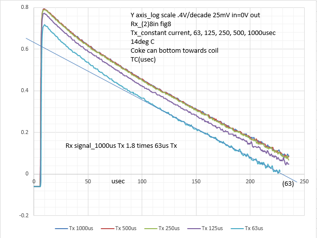 Coke can signal decay with different Tx times. Don't know why 500us and 1000us Tx aren't the same. Tx times greater than 5 times the target TC shouldn't increase the signal. Two times the signal doesn't increase detection depth very much.