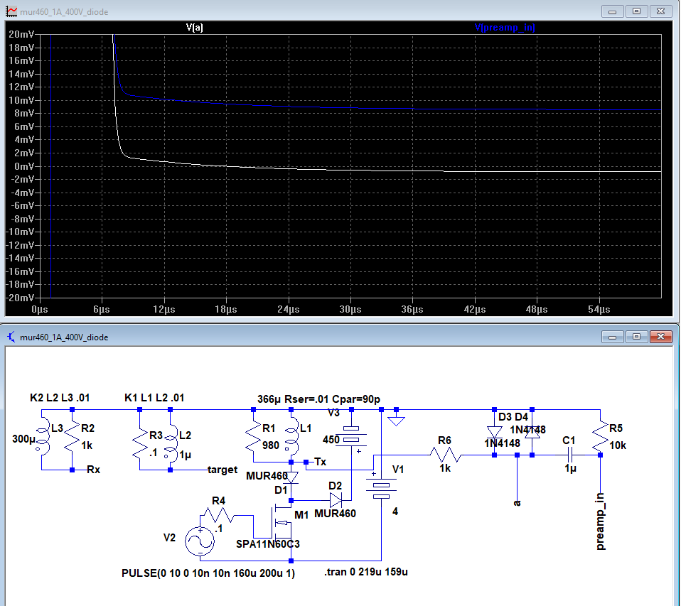 It is useful to simulate the TX and preamp portions in Spice, and see how the flyback & decay respond to changes in the timing or circuit values. You can even introduce a target by using a mutually coupled LR (this shows up in other threads, you'll have to poke around to see).