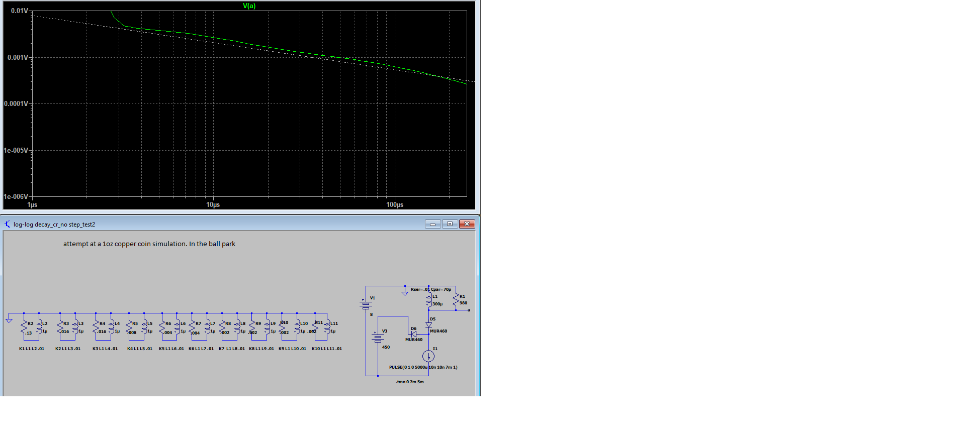 An attempt at the 1oz copper coin. Could be better. I had thought skin effect was causing straight line decay log-log in the beginning but was told it's something else.Originally posted by Davor View PostCoins under a PI tend to have high dependency on their thickness, due to skin effect obviously. How to simulate skin effect? I have no idea yet.