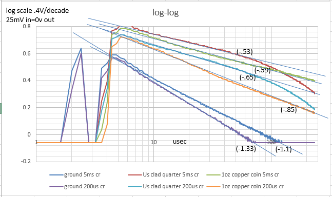 I see I forgot to label Y axis charts reply #23. log scale .4V/decade, 25mV in=0V outOriginally posted by green View PostDid a test with different thickness copper plates(.05mm protective film each side of plates) and stacked(.1mm protective film between stacked plates) to see if anything makes sense. Still trying to make sense of the data. All plates decayed straight line log-log in the beginning. I have some copper foil(.0178mm and .0343mm thick)to cut in 102mm squares to test yet. Maybe someone sees something that doesn't make sense or does?