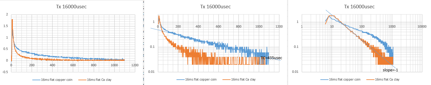 Thanks for the replies. Best way to record and chart the data? What targets to record? Constant current or constant rate Tx? Tx time, 100us, 5000us or something between? Tx time needs to be long for ground 1/t decay. Interested in your or anyone thoughts.Originally posted by Davor View PostGuess faster decaying materials would lead to more useful data. This way the end of curve picks a lot of noise. I think you should put both lin and log time diagrams. Point is that you may put a tangent line that will fit just about anything. The fact these fit fine in a long span only confirms you may make a new patent on old technology by merely using some odd curve that you implement a math module for. The company-whose-name-must-not-be-said recycles the GB mechanism at early samples to attenuate water response. As we know GB obeys 1/t law, but water may respond as ever it likes, and yet at a limited stretch of time the same mechanism will do.
