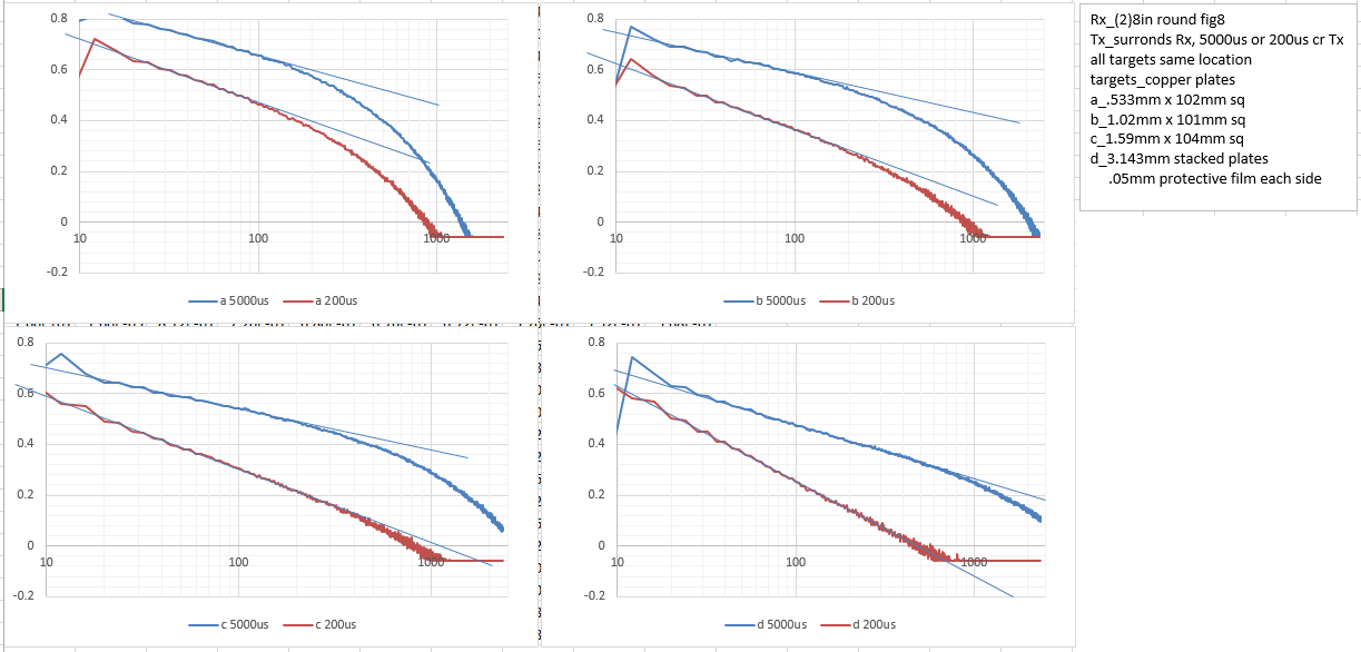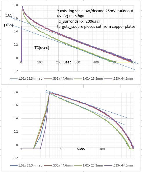 Before I built the target tester I charted a lot of target decays. Recorded amplifier out, no target and a target recording. Subtracted the no target recording from the target recording in Excel and then charted the result linear-linear, linear-log or log-log. Subtracting no target from target eliminates amplifier offset if recordings are done close enough together. Didn't get as clean a chart but good enough to see decay. Chart I posted awhile back using the subtraction method.Originally posted by Davor View PostVery few people will have the equipment like yours at hand.
