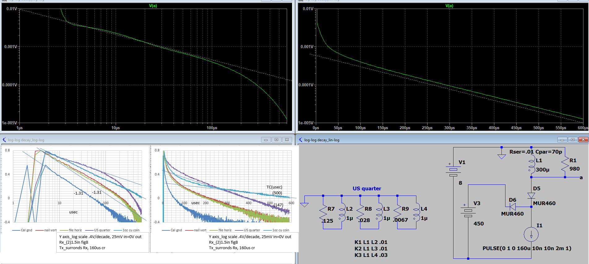 Copied some simulation targets from another thread. Probably changed the driver to a current sink. Added the three on the left(L parallel with R). All targets decay straight line linear time log amplitude except for the foil target, it oscillates. L parallel with R makes a good foil target. Most if not all targets I've charted with a TC 10us or less chart straight line linear-log. Targets with a TC over 10us aren't straight line linear-log in the beginning unless they are thin. The reason I thought skin effect was causing it. Seems like skin effect has to cause some effect, to chart straight line linear-log, R has to be constant. Is there a way to calculate time when R is constant for thicker targets? Wanting some spice targets that chart what my tester does assuming it is correct.