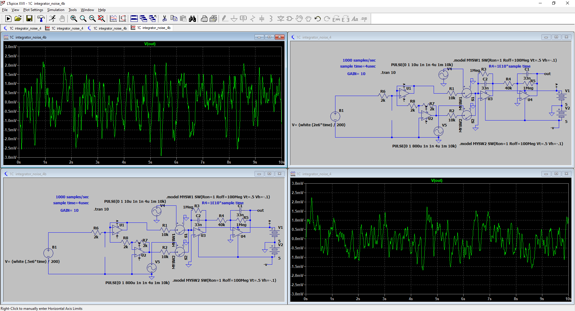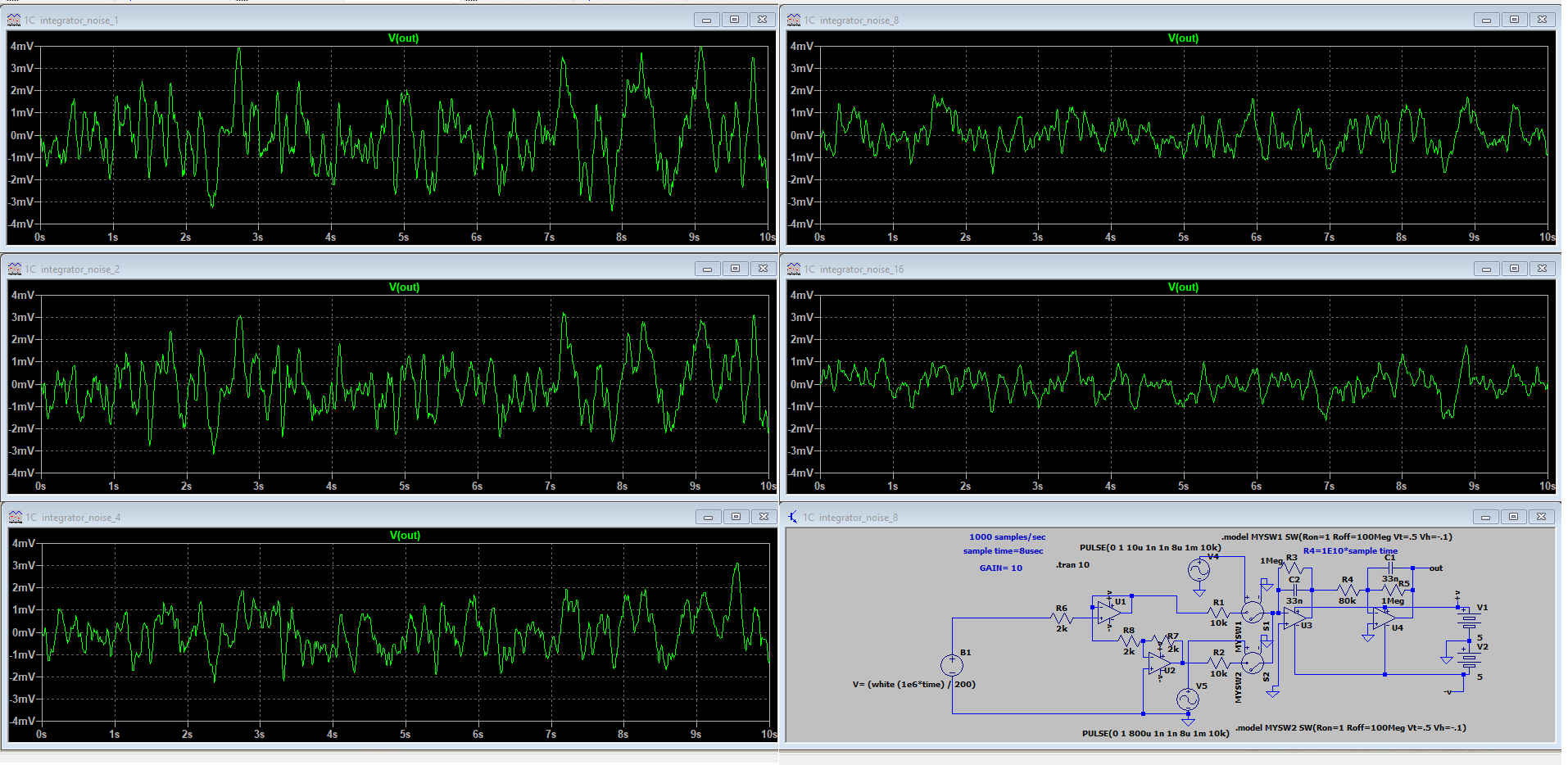 After looking at Carl's reply #5 I'm thinking(2e6*time)is 2MHz cutoff. Tried sampling at 1, 2, 4, 8 and 16us to compare noise level. (1e6*time)1MHz cutoff? R4 changed to keep integrator gain constant. Was wondering if sampling with an A-D(1us sample)would have more noise than sampling with an integrator with longer sample times. The spice analysis suggests it does. Depending on the target TC the increase in signal might be greater than the increase in noise. Wondering if there is a best sample time.