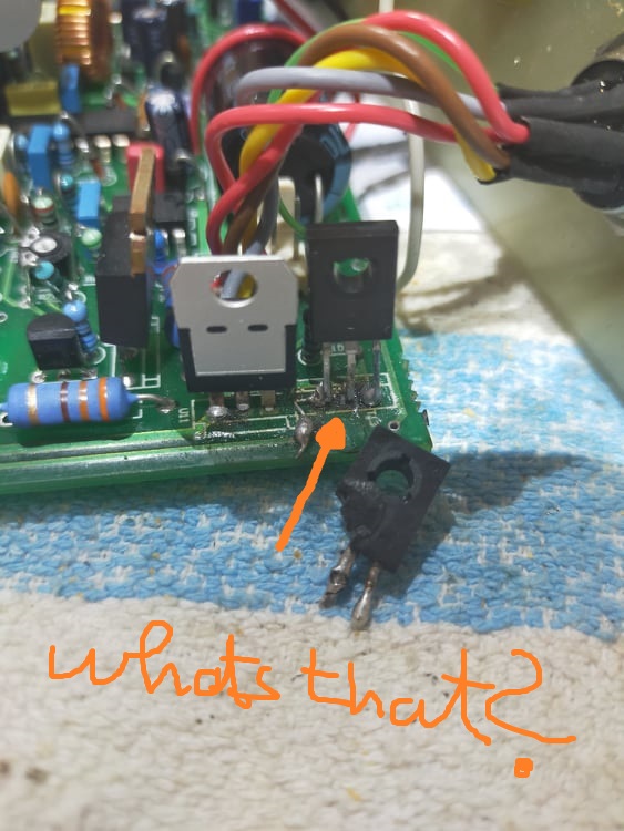 I hate seeing repairs made with a plumbers iron, just cut the transistor legs at the body and use the old legs as pcb pins and lightly solder the new tranny to old pins takes only seconds to do and saves destroying the pcb and makes further replacements easy.
