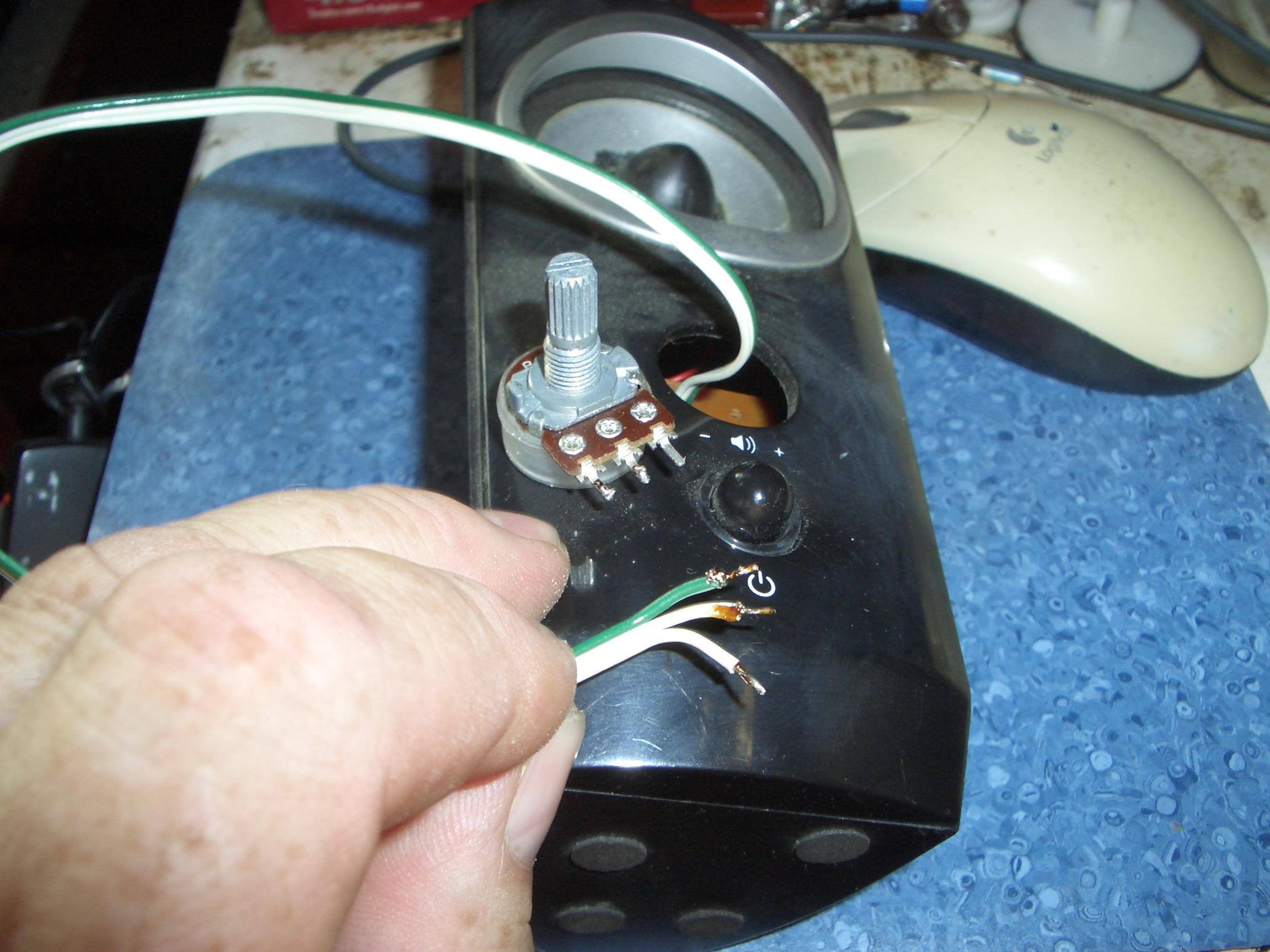 my simplest way to check a pot. i took old pc speaker, must be active, with amplifier. desoldered pot from it, soldered wires in pot holes at pcb.