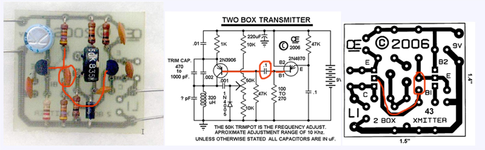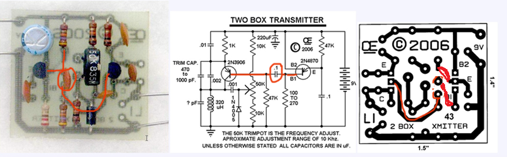 but in the PCB and finished board of transmitter the pol of capacitor go to emitter of transistor (2n4870), instead of b1