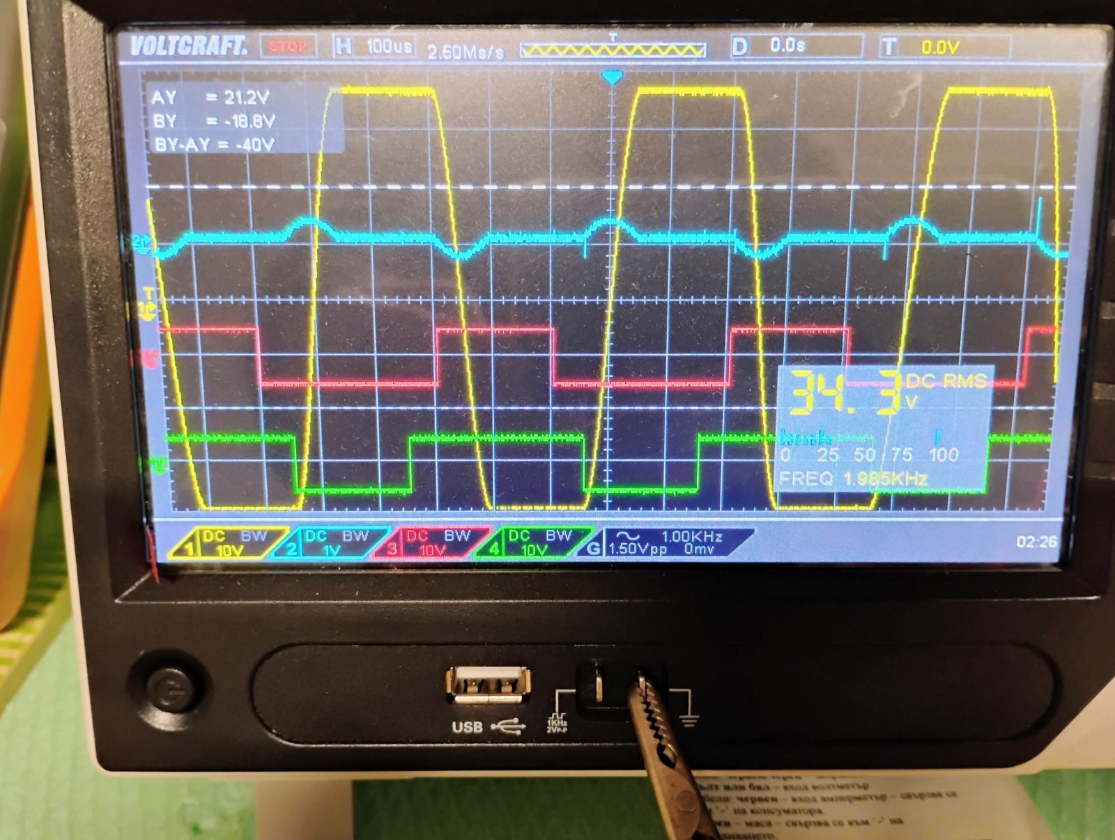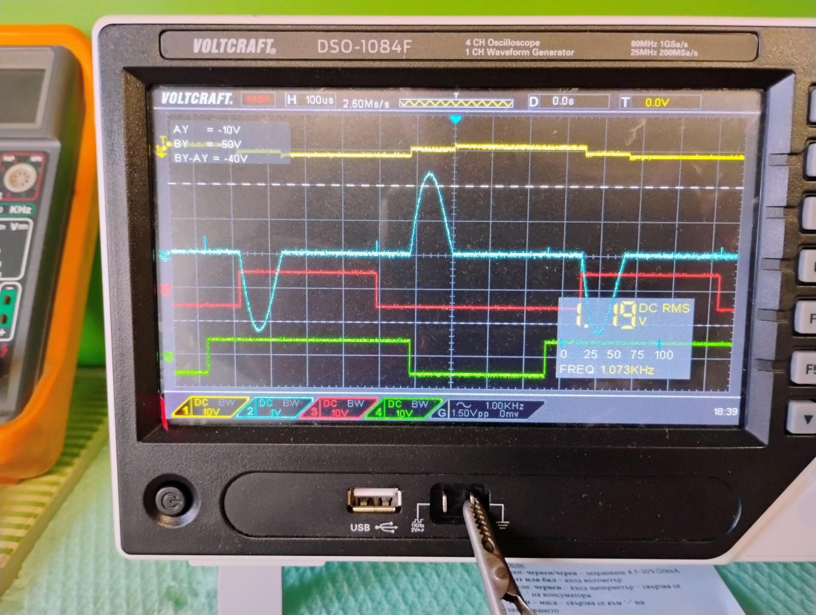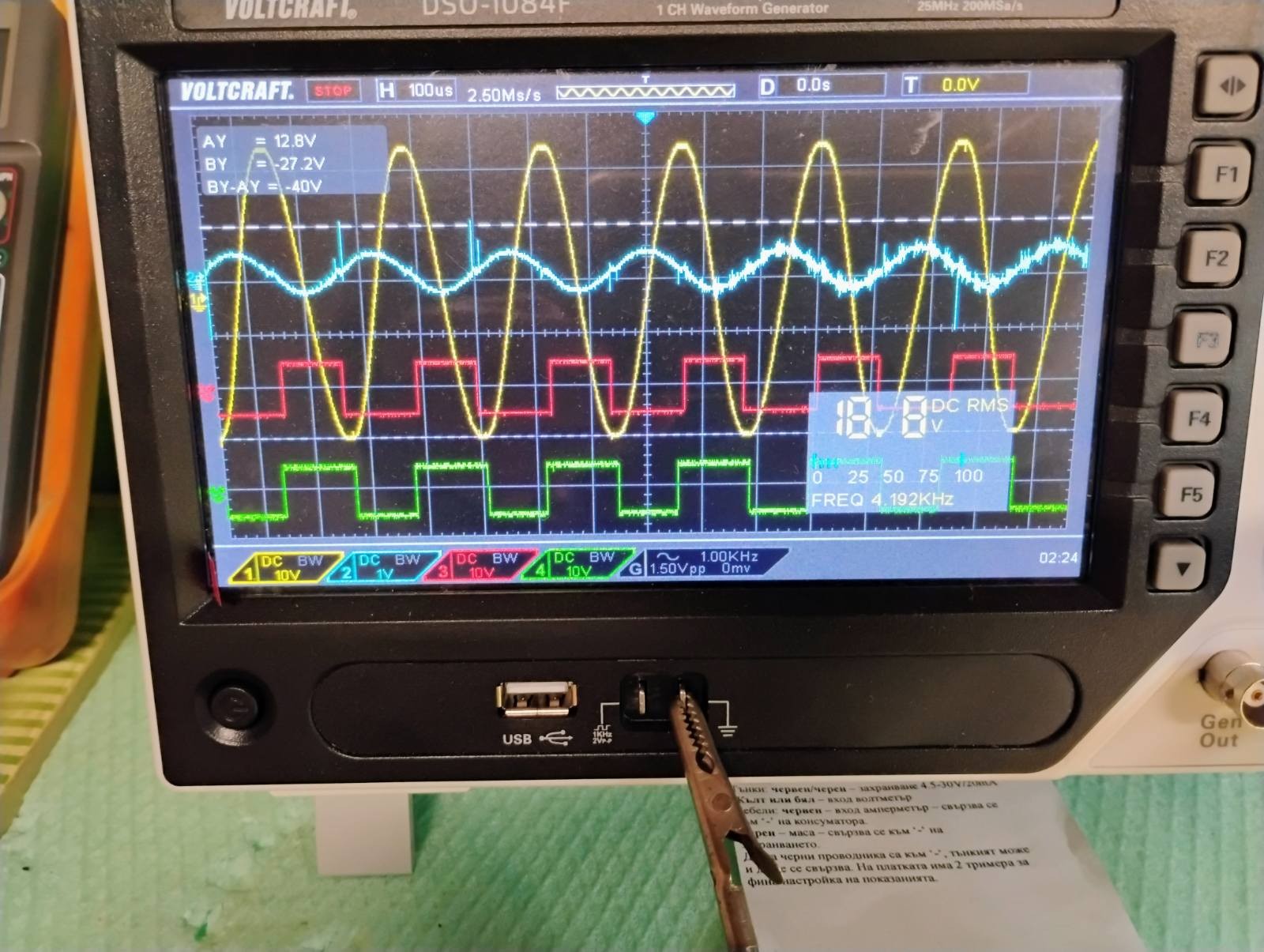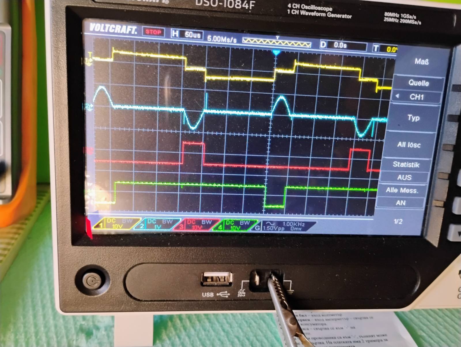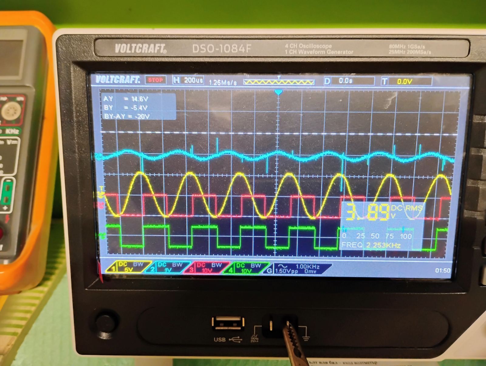 Dark Blu = TX current ( 400mV pp ) sensed by 0.1 ohm resistor in TX leg.