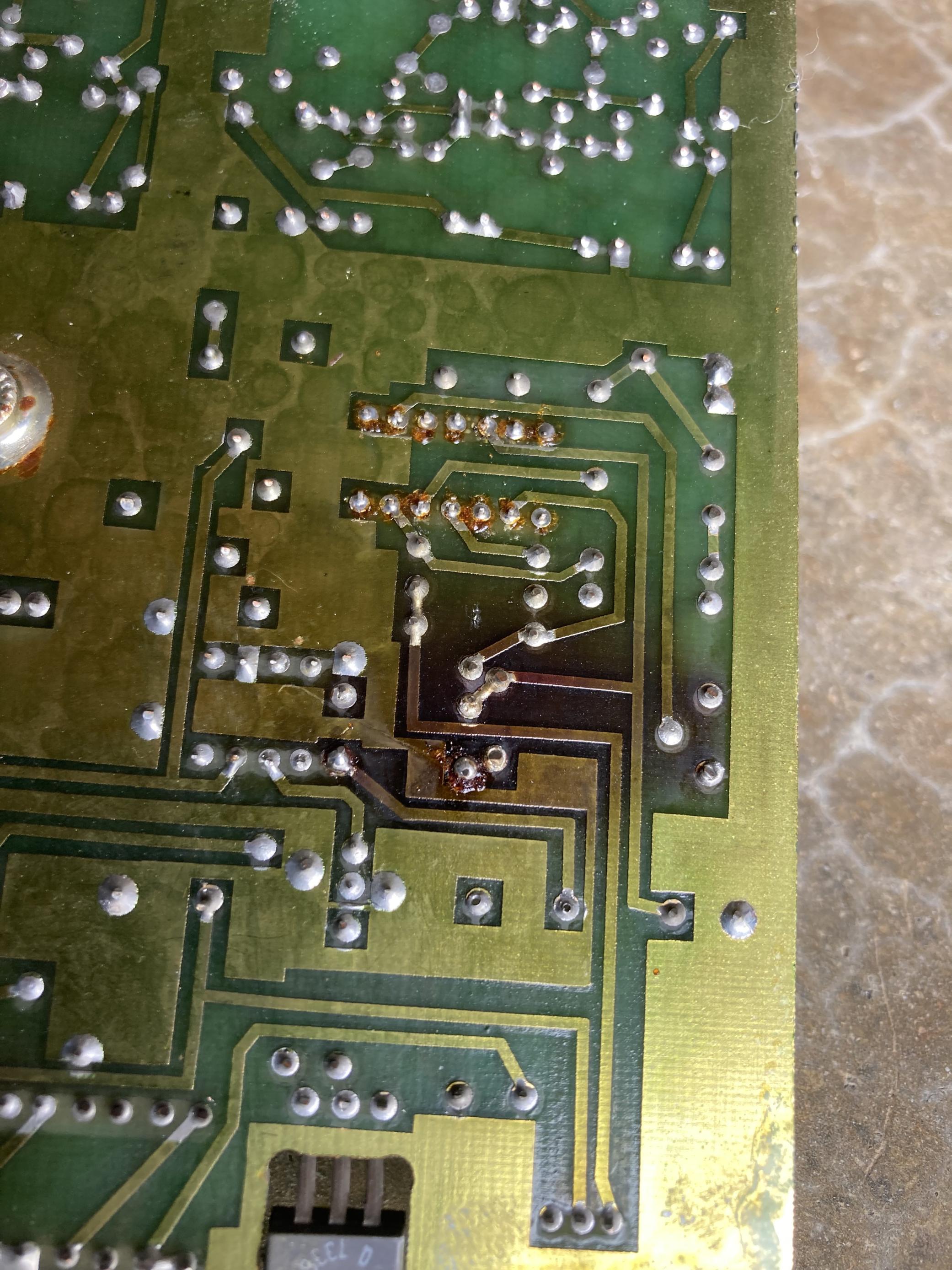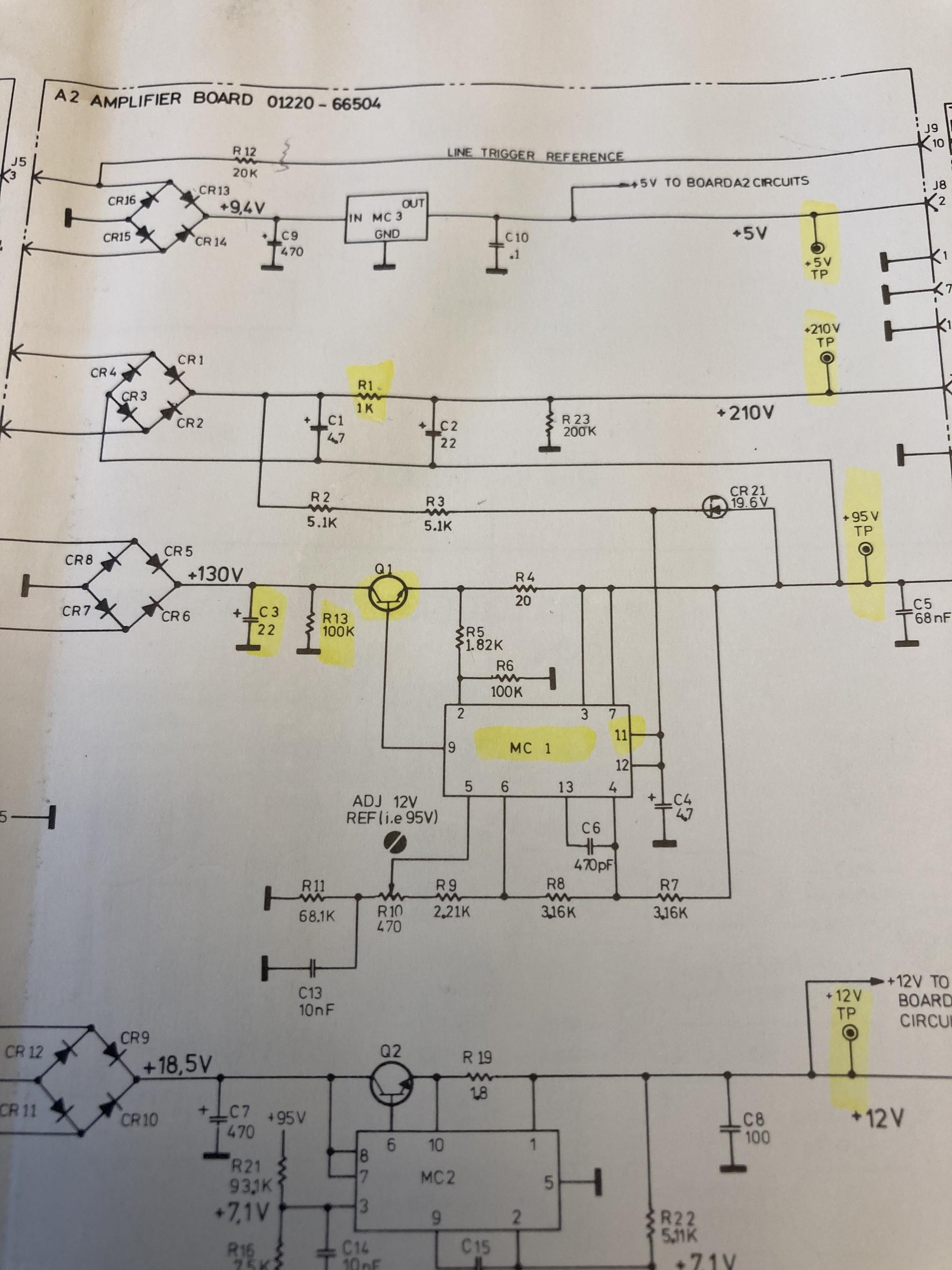 Thought I'd see if I could locate the problem area since the test point voltage of +210 and +93 were too high. Removed transformer and check each diode, all okay. After hooking everything back up thought I'd turn on and test voltage drops in both circuits, (see photo). Left the scope running while studying the schematic and notice what seemed like a little more heat coming from the same test area. I'm guessing I let it run 20 minutes or so when I head a sudden pop, knowing something had just blew out. Looking closely I noted some of the resistors in the +210 and +93 circuit were not the original, by how modern they looked compared to the rest of the board. Cap C2 was slightly swelled on top and was very loose to the touch, slight pressure and the cap detached from the board. Actually could be slightly moved when pulling. Moved to scope to the outside and the extra light revealed 3 major burn areas on the board where the caps and resistors live in the said circuits. Just thought I would share, very interesting. Click image for larger version