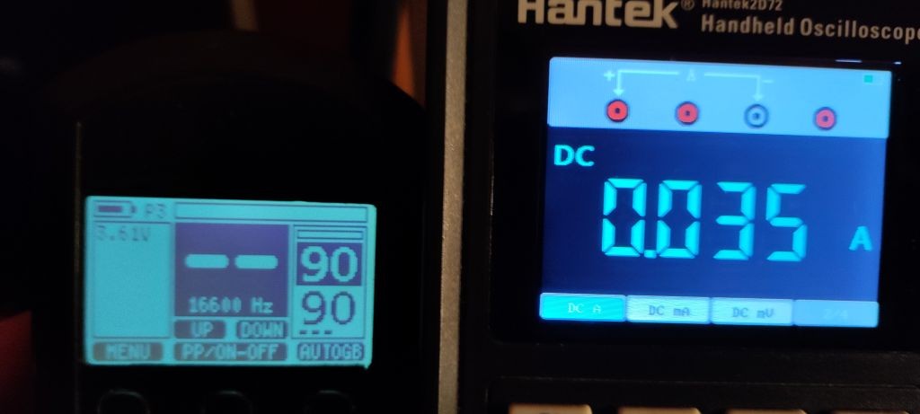 • Now I did a current measurement because I wasn't completely sure of the current draw so the current at a frequency of 16.6kHz is 35mA in my electronics which I replaced in the X35 coil.