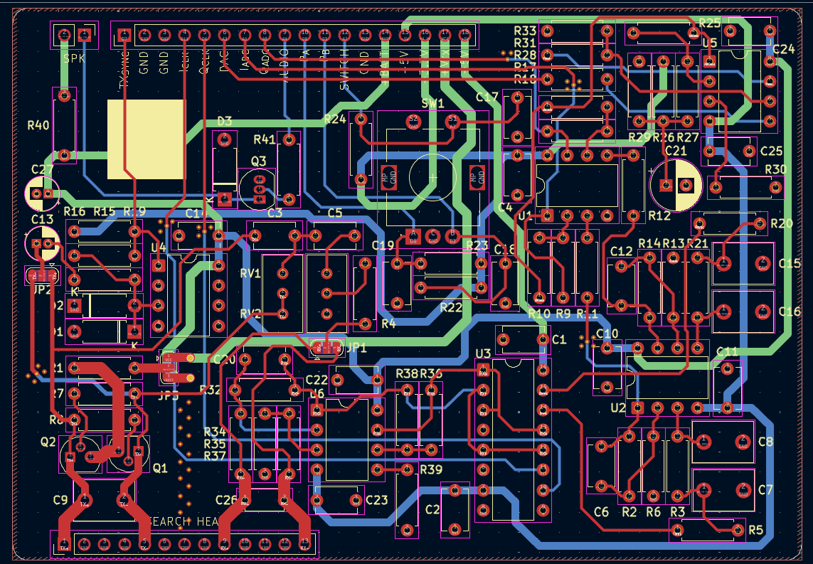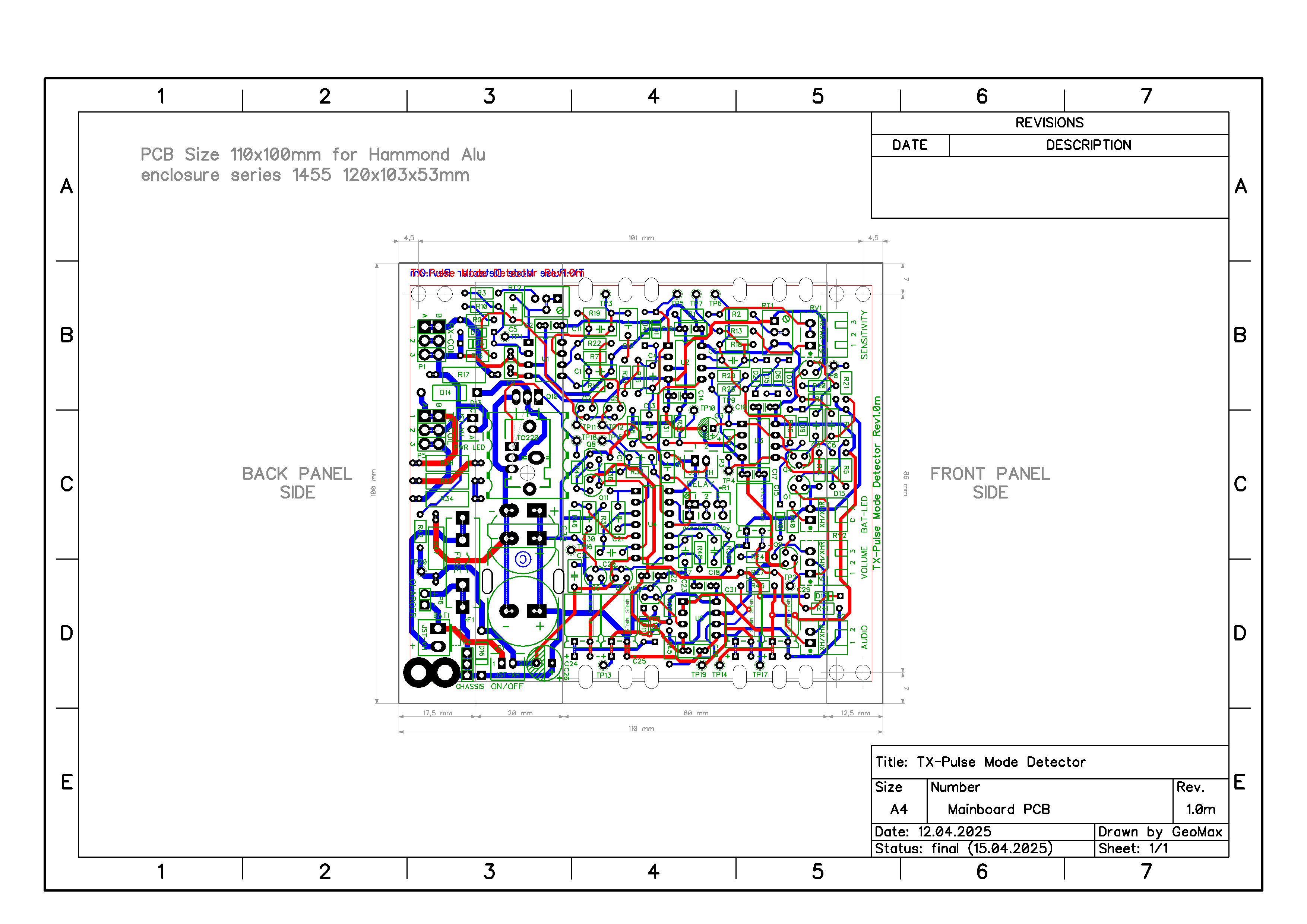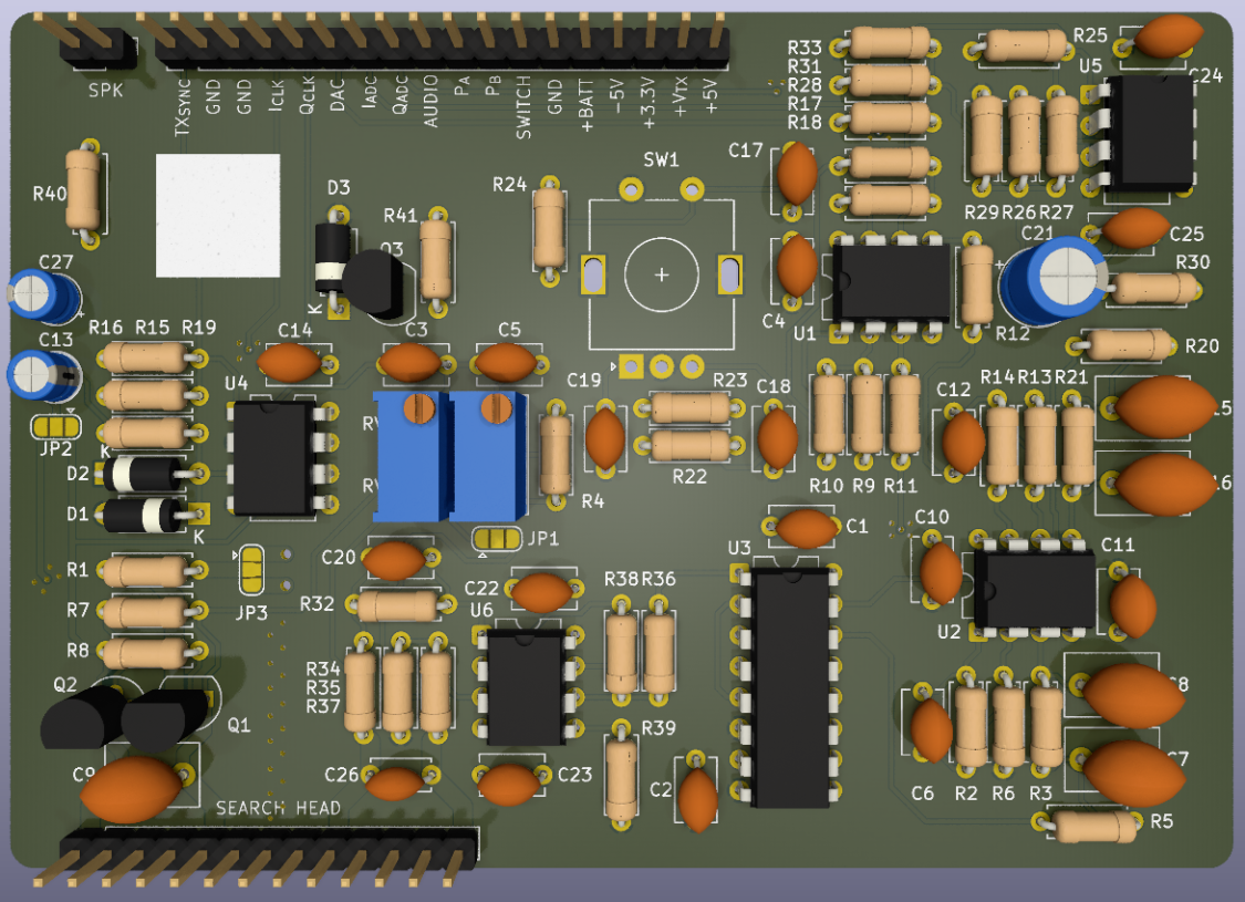 During the initial planning phase, there was an idea to create a 4-layer board. However, this was rejected because no microcontroller is used. The original initial circuit diagram can be found here in the Geotech forum (see below). The detector is a design by Detectorist#1, and I created the circuit board for this project. The plan is to publish the entire project in the Geotech forum after final testing. We chose a Through-hole design because it makes the project easier for people to assemble.