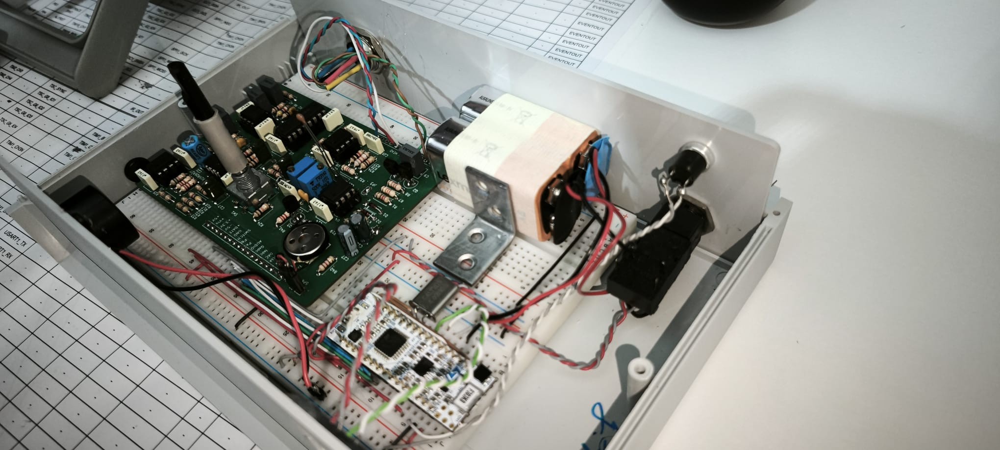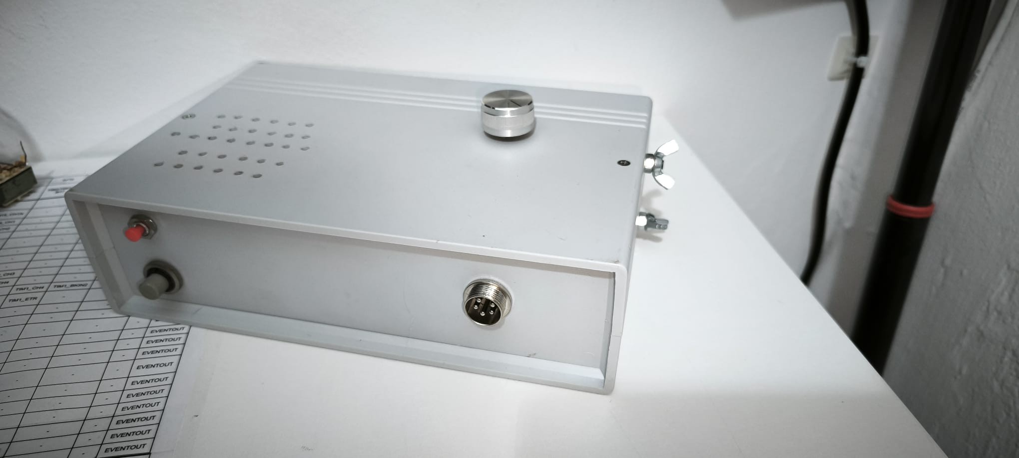 The device is now fitted into a nice plastic box. I wish I could go back in time and not make those holes—they were supposed to be used as a sound output for the speaker, but turned out awful. You can find an on/off switch, a reset pushbutton, the coil connector, and an I2C OLED display.