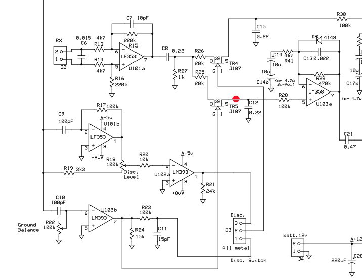 My coils are 5.9/6.7mH .I decreased 15nf to be able to make ferrite rejection in the middle of the GEB pot.For discrimination pot I use 20k instead of 100k. It reduces Tx signal from generator and also makes sinus correct -without this crack on the edge.Also I changed one of 100pf caps -those to LF353 -to 47pf.It reduces signal at pin 1 -sinusoide with some cracks.I hardly can detect 1euro -25-27 sm only with very fast moving the coin..