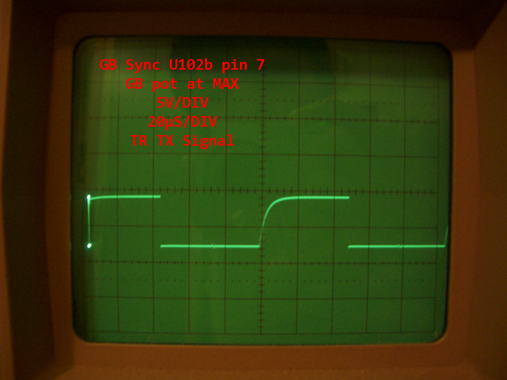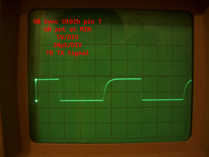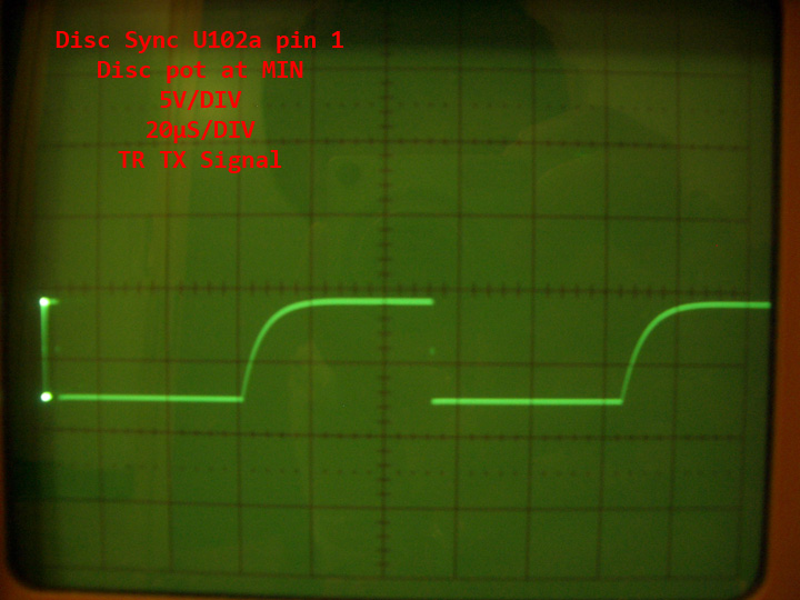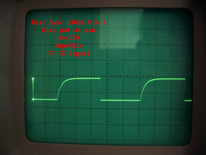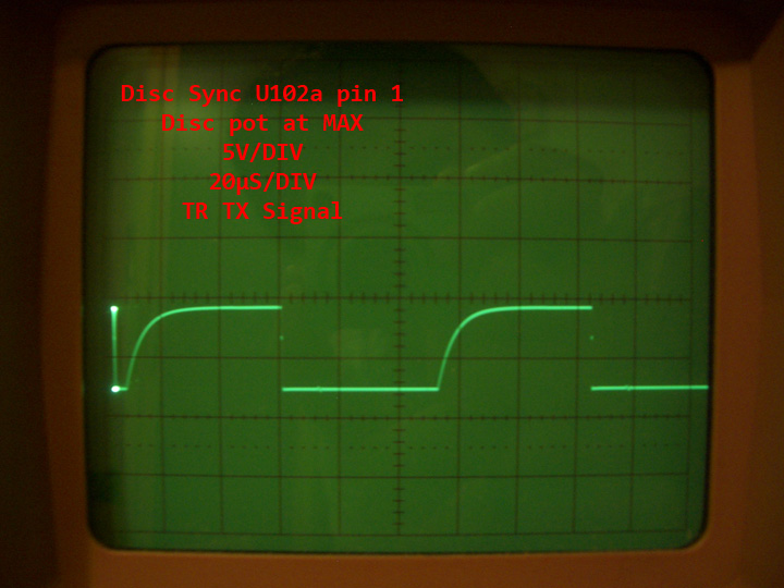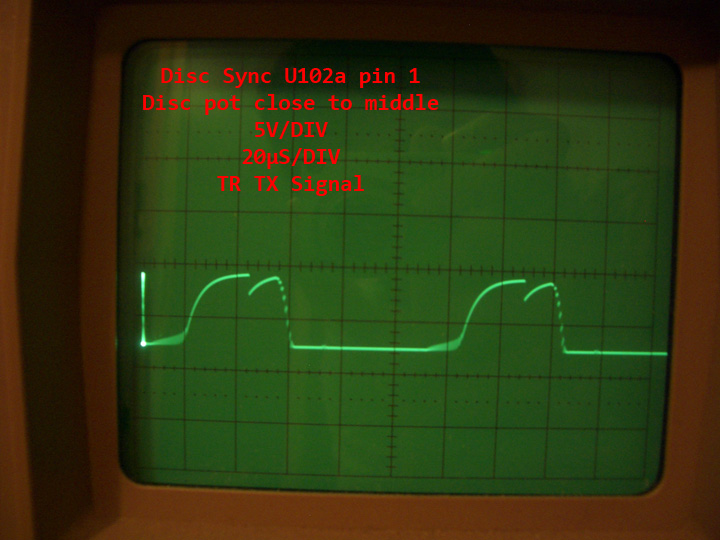 TGSL DISC control circuit has well-known behavior with jagged waveform at LF353 (U101b) output pin 1, sometimes causing break-up of sync pulse at low DISC pot settings.