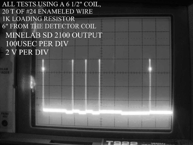 I have attached a pic of what the SD 2100 signal looks like when observed using a simple technique of making a coil, adding a resistor across the coil leads and observing this new coil signal with a scope with the new coil a finite distance from the operating coil of a detector.