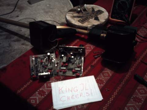 Removed all controls from front panel, separated PCBs. Hooked up 8 cell AA rechargeable battery pack to pins 7 & 8 of ribbon cable socket. WE HAVE LIFE!! Well, sort of. Voltages are acceptable (-3.96V & +3.89V), so power supply/voltage regulator working. Without coil connected, the TX oscilator output is 81kHz and unstable. With coil connected, TX signal looks terrible. Only abot 3Vpp; very unstable looks like 4kHz & 5kHz intermodulation.