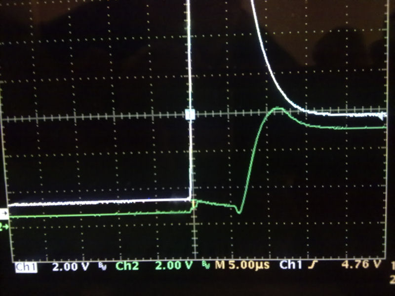 The green trace is the end of the 100 uS tx pulse drive on the MOSFET gate.