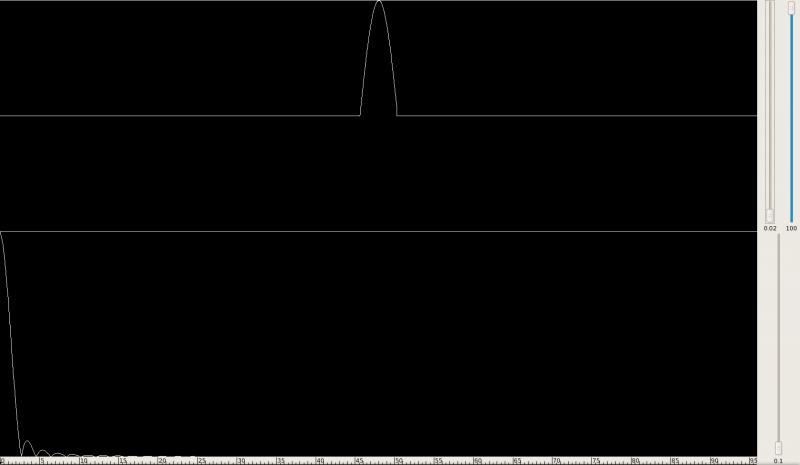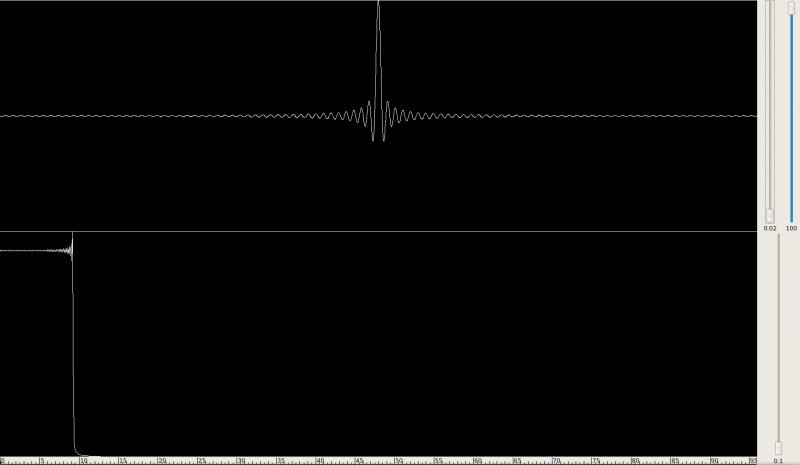 now have a look at the sinc pulse ... only running to 10 Khz BW here. The time domain has a sinc characteristic ... top half of screenshot ... the frequency domain .. lower half has a rectangular pulse characteristic ... and if you are wondering ... yeh ringing still occurs even in frequency domain. There are 2048 frequency slots in that spectrum ... all of ( nearly ) equal amplitude and known phase. ... ie 2048 parallel virtual detectors.