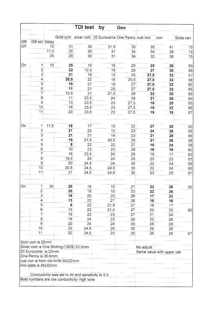 I adjusted the TDI at 10us, GB=on, GB at 9 (at this place it made ground balace), all conductivity and sensitivity about max.....(not erratic signals). I went up of the ceramics without any any problem