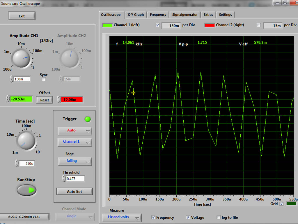 You are mostly interested in envelope of the signal, so you may increase a time base to 10ms, or even 100ms and it will give you a somewhat less confusing display. This is a nice display of a signal sampled near Nyquist frequency, and there is nothing you can do to make it better with the existing soundcard. It would improve if your sampling rate is 96k, but it is unlikely that your soundcard supports it.