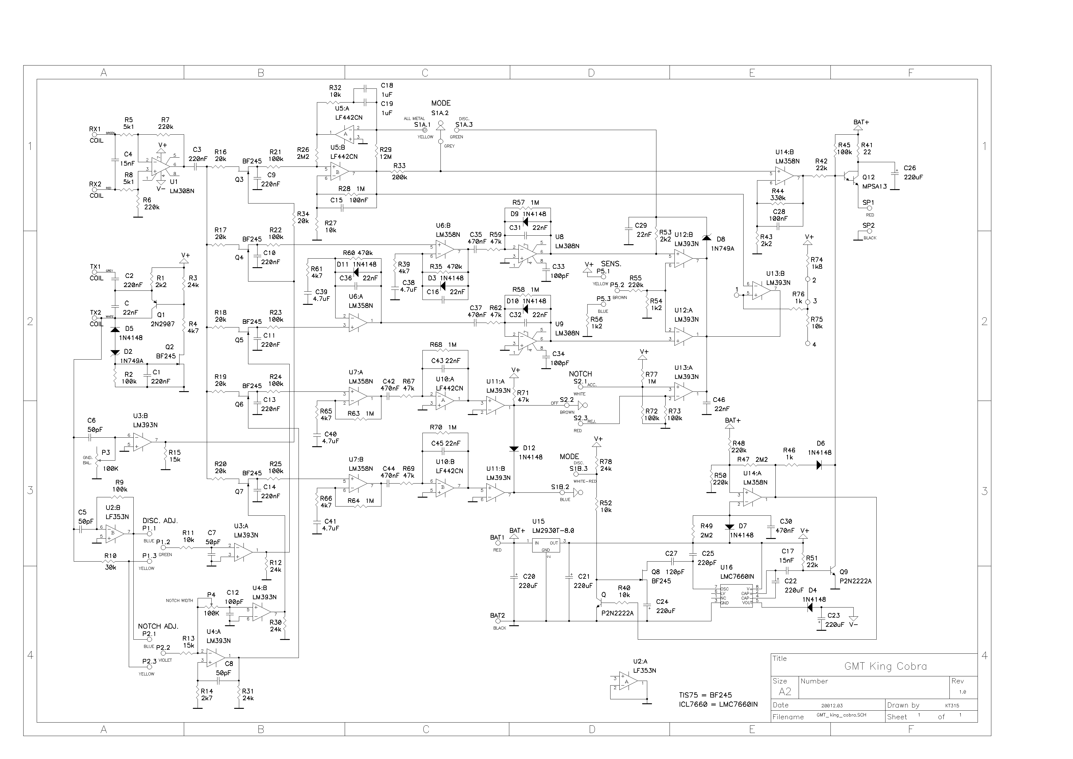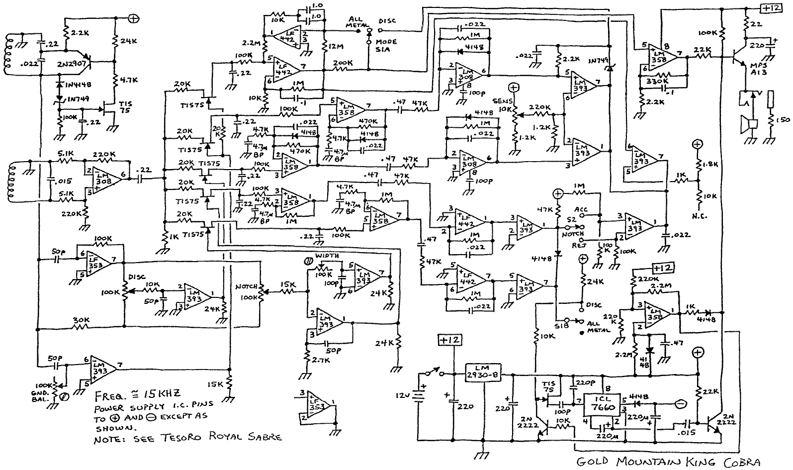 As far as I know, no one has made a clone of the King Cobra. You would have to layout your own printed circuit board. I have not seen the coil data either. Since it is a Tesoro clone, it probably is the same as Tesoros of the late 80's early 90's. I have a King Cobra but I have not checked the inductance of the coils yet. I have done a quick calculation given the alleged operating frequency and the caps listed on the schematic and it (coil) does appear to be the same as Tesoro. It is basically a Golden Sabre with a non-motion pinpoint or a Royal Sabre minus the surface blanking circuit.