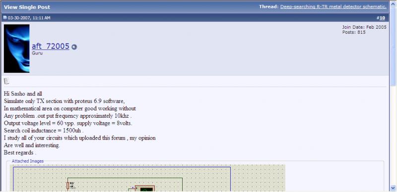 Hi mesy 64 Please see this link : http://www.geotech1.com/forums/showpost.php?p=52233&postcount=10 simulated only oscillator section at the past . out put voltage was 60 vpp working frequency 10khz with 1500 uh coil .( depended to resonance circuit) but sascho said working frequency is 11 kHZ . also I test only oscillator section at practice . result seem as simulated . this oscillator can be drive serch coil for perfect electromagnetic field. Power enough for two box . Best regards.