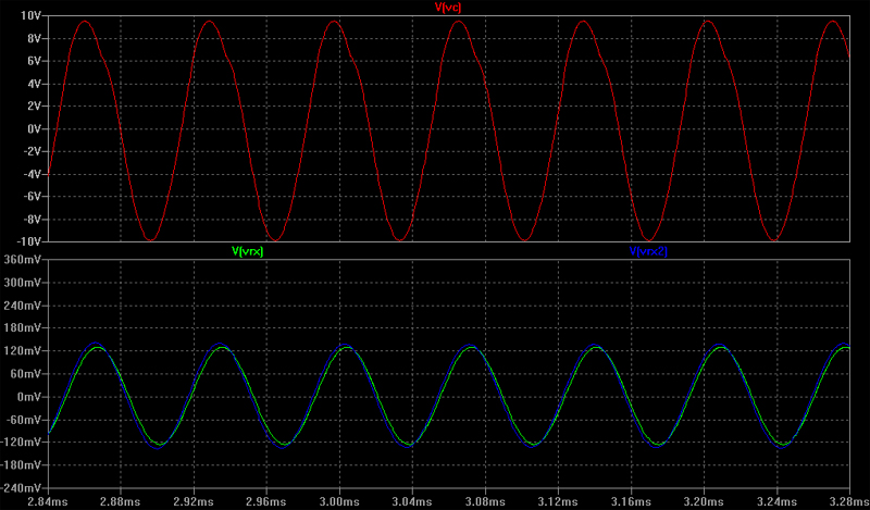 The simulation seems not to show much difference at the output of the op amp which stands in for the LF353 (Vrx1, Vrx2).