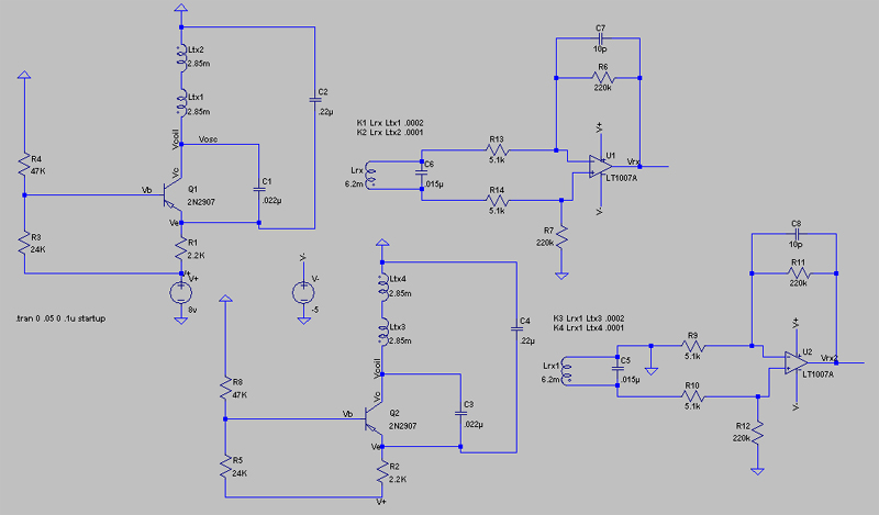 The simulation looks more complicated than it is because there are two identical TGSL front ends not connected. One has the RX coil lead grounded as we do.