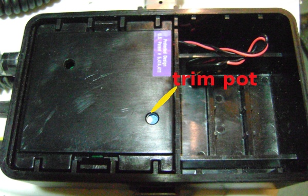 Inside the box where the the PCB is covered by a plastic top.There is a hole in the top revealing a Trim Pot.