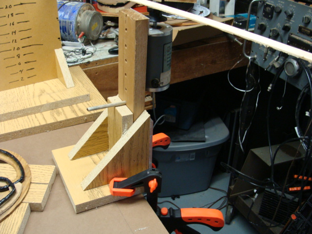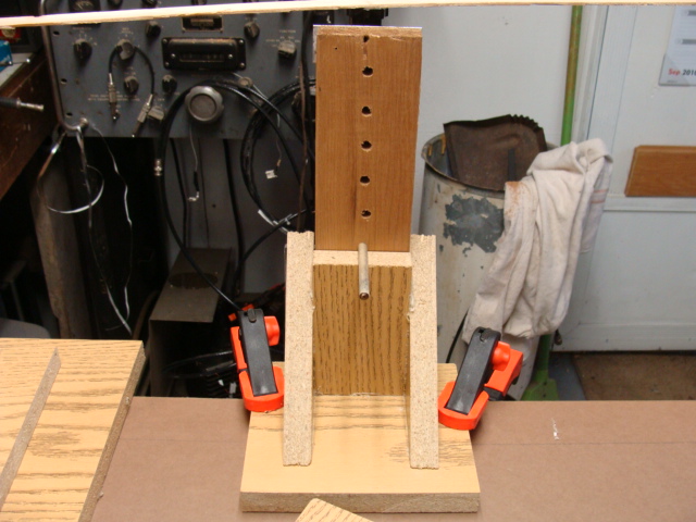 The 1x3 inch board with holes spaced 1 inch apart is free to move up and down by moving the wood dowel to another hole. This lets the height of the test coins be adjusted from about 5 to 25 inches. This will cover any detector that I am likely to build.