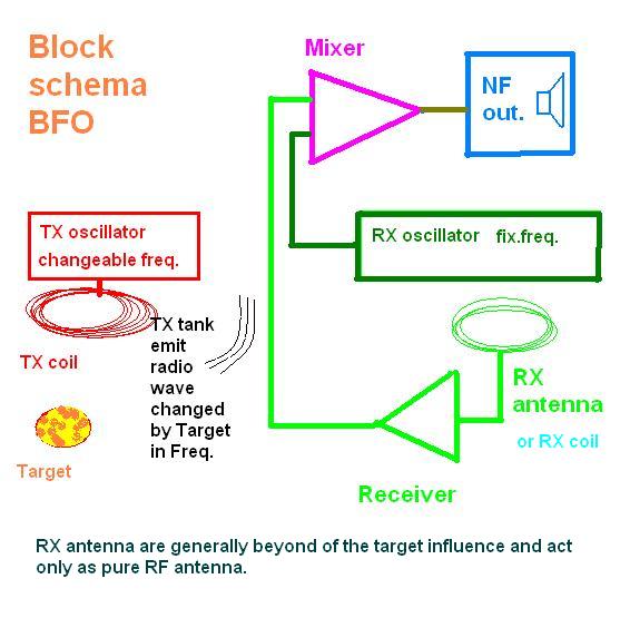 BFO (Beat Frequency Oscillation) - Metal Detectors using BFO technology have two coils of wire, one large coil is located in the search coil of the detector, the other small coil (act as RX antenna) of wire is located within the System Control Pack. Each coil of wire is connected to an oscillator that produces pulses of current. These pulses of current pass through the coils generating radio waves. A receiver housed within the System Control Pack receives the radio waves and makes a series of tones based upon the frequencies of the radio waves. When the detector search coil passes over a coin or other metal item a magnetic field is created around the coin or metal item, this magnetic field causes interference with the frequency of the radio waves generated by the search coil. And changes the tone produced by the reciever (of radio waves, and radio waves can be received only by antenna, not by finger, and antenna is coil - always - in this case RX coil).