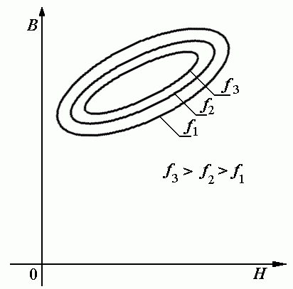 Now let we involve the conception for unidirectional sine induction and imagine that coil current oscillates between points Im and 0. We can make a real experiment because exsist function generators, which can add DC component to output wave. What happens when we increase frequency of oscillations? The point 1 moves faster and the lag of point 3 increases. In frequency domain that means the phase lag of induction B relative to excitation H increases.